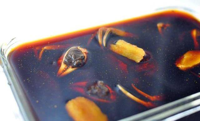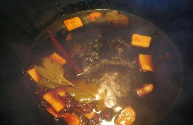 然後鍋中燒開水,下入各種香料,燒開後小火煮20分鐘。接著倒入花雕酒煮開,關火後倒入高度白酒,放在一盤冷卻。