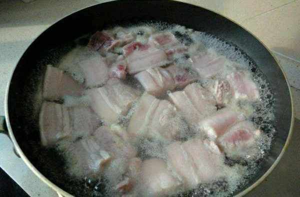 紅燒肉切好以後,放入水中焯一下,去除血沫。等水開瞭以後,焯上個三五分鐘就可以瞭,然後將鍋中的水倒掉,將煮好的紅燒肉瀝幹水分!