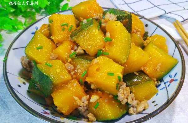 南瓜洗幹凈表皮,對半切開,把裡面的籽和瓤去掉,然後帶皮切成小塊。大蒜切碎,豬肉剁成肉末加少許鹽和胡椒粉,醃制10分鐘左右。鍋燒熱,加入少許油,油熱下肉末翻炒至變色,然後放入蒜末炒出香味。放入南瓜塊,翻炒片刻。加入小半碗清水,加一湯勺生抽,一小勺鹽,少許白糖,蓋上鍋蓋,中小火燜煮至南瓜軟糯,大概七八分鐘就可以瞭。七八分鐘後,南瓜已經很酥軟,湯汁也收差不多瞭,撒上少許蔥花,翻炒一下,出鍋即可。