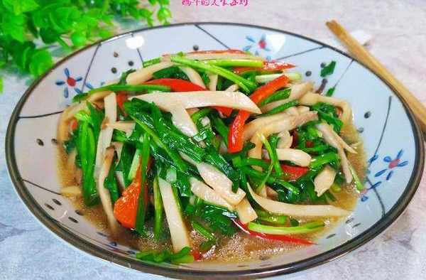 韭菜洗幹凈切成3-4厘米的段。韭菜洗幹凈切成3-4厘米的段。杏鮑菇洗幹凈,先斜切成片,再切成絲,生薑切絲,紅椒去籽切成絲。鍋中加適量清水燒開,放入切好的杏鮑菇焯一下水,焯好撈出過涼後擠幹水分待用。另起鍋,倒入少許油,下薑絲爆香,接著倒入杏鮑菇,翻炒片刻,然後加一小勺生抽,翻炒均勻。再加一點點清水炒勻,然後倒入少許薄水淀粉。加入切好的韭菜和紅椒絲,加半勺鹽,翻炒均勻,出鍋即可。