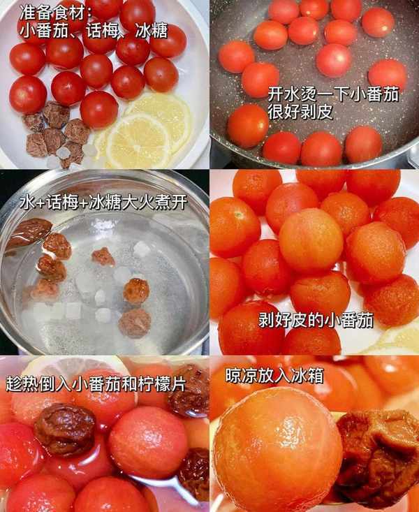 (1)小番茄煮1分鐘,放入冷水中去皮水;(2)加入話梅、冰糖大火煮三分鐘趁熱放入小番茄和檸檬片;