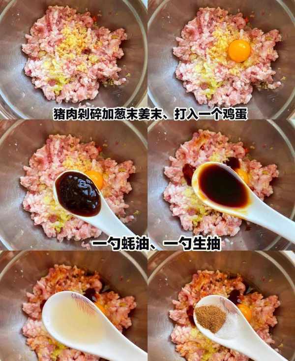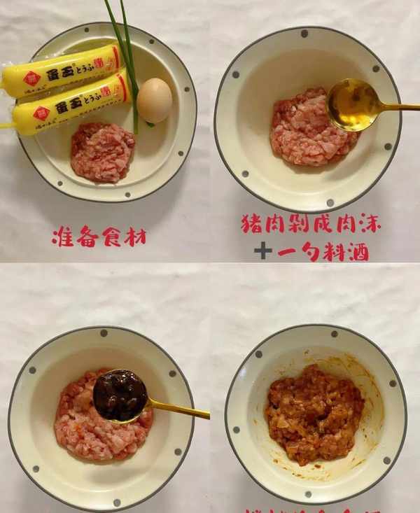 (1)豬肉絞成肉沫,加入1勺料酒、1勺黃豆醬攪拌均勻備用;