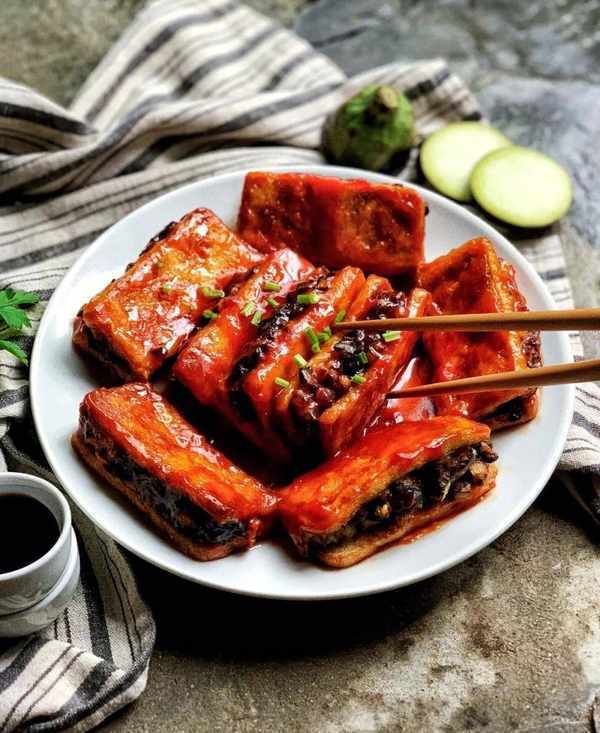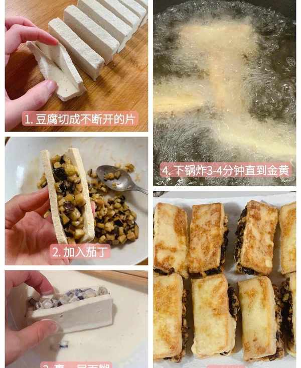(2)將北豆腐控水後,切成(如圖)連續不斷的小塊。將茄子夾入其中;