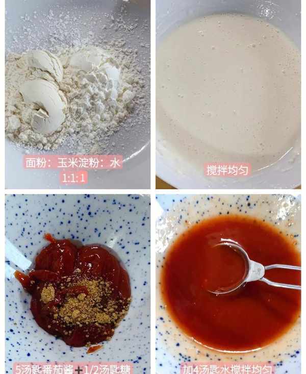 (5)番茄醬、糖、水,混合均勻。另起鍋,將其加熱至冒泡,倒入炸好的豆腐盒,小心翻動,裹滿番茄汁即可出鍋。