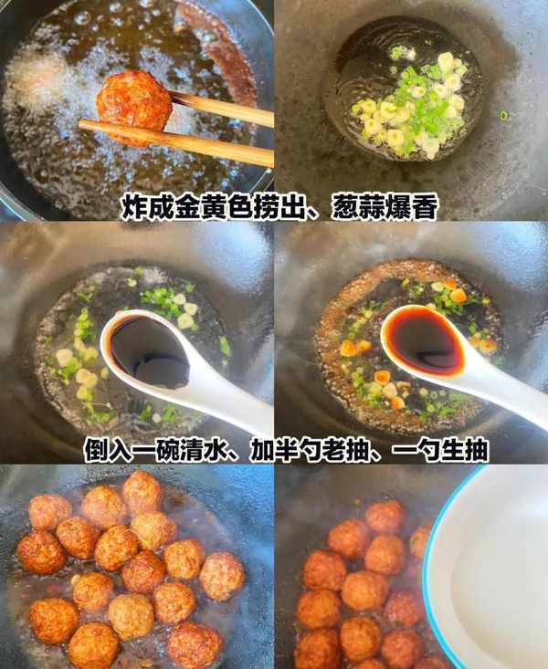 (3)鍋裡留油,蔥蒜爆香、加一碗清水,加半勺老抽,加一勺生抽,下肉丸煮10分鐘,加點水淀粉勾芡收汁,裝盤撒上蔥花即可。