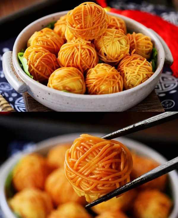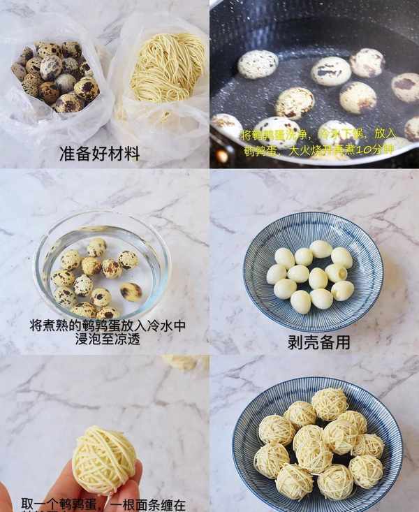 (3)取一個鵪鶉蛋,一根面條纏在鵪鶉蛋上,一圈一圈的纏至鵪鶉蛋全部被面條包裹上即可,每根面條的。尾部,用另一根面條壓緊,最後一根面條纏完後將尾部繞過其它面條中壓緊即可;
