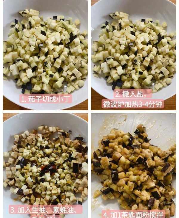 (1)將茄子切成小丁,加入少許鹽,用微波爐加熱3-4分鐘後,加入生抽、蠔油、香油,拌勻。接著加入一勺面粉攪拌均勻;