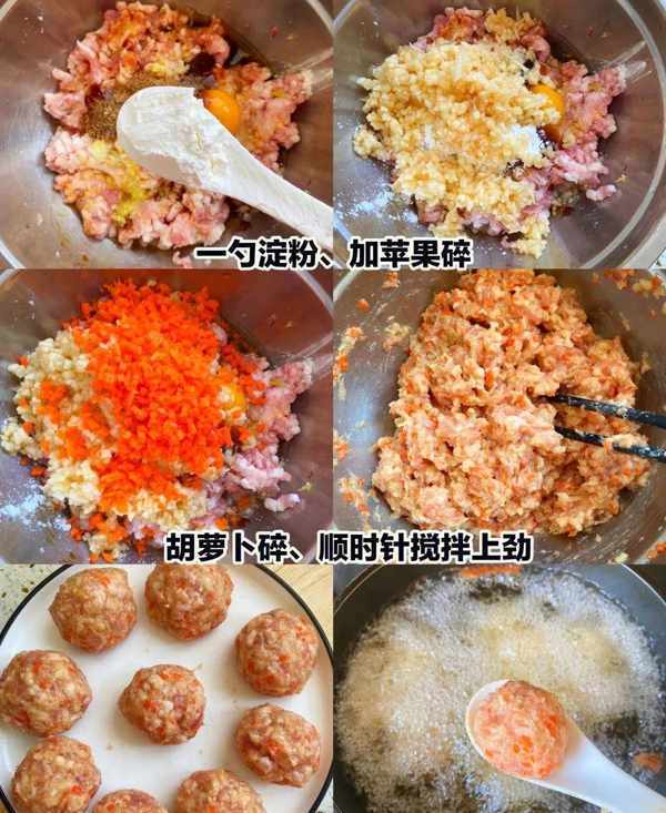 (2)搓成大丸子、油溫7成熱放入肉丸子,炸至金黃撈出;
