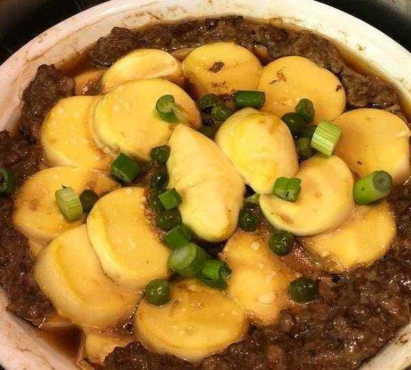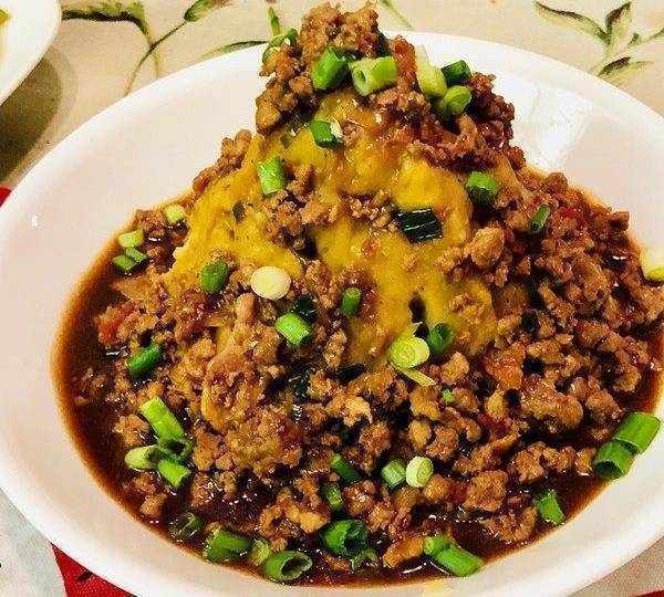 火山土豆泥:土豆切片蒸熟,土豆片加點鹽壓成泥,熱油,下肉沫,蔥薑,料酒,生抽,小半碗水,就是平時炒菜的過程,調料隨自己喜好添加,土豆泥在容器裡堆成山型,筷子紮幾個洞,入味兒,炒好的肉沫帶點湯汁,澆到土豆泥山上,表面撒蔥花或者香菜芝麻即可!