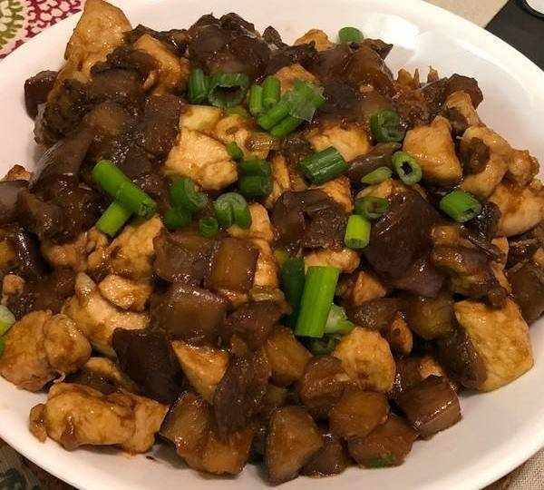 雞丁燒茄子:雞腿去骨,切成小塊,放入少許淀粉,料酒,耗油,一點水抓勻,醃制20分鐘,茄子洗凈切成小塊,鍋中放油,中火慢慢抄茄子丁,炒熟變色後盛出備用,調辣醬汁(韓式辣醬:蠔油:白糖:料酒按照1:1:1:1的比例)備用,鍋中放底油,放入蔥蒜爆香,放入醃制好的雞腿肉,炒變色後放入茄子丁,最後淋入調好的辣醬汁,放少許鹽調味即可出鍋