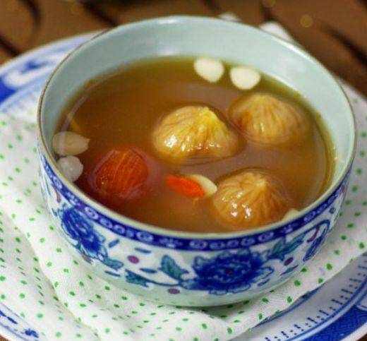 無花果瘦肉湯:瘦肉洗凈、切丁,鍋中燒水,水沸騰後放入瘦肉丁焯燙,肉丁變色後即可撈出,洗去浮沫,將出去枸杞的所有材料放入湯煲中,加入足量水,大火煮開後,轉小火煲2小時左右,加入洗凈的枸杞,繼續煮5分鐘後關火,根據個人口味加鹽調味即可,獨特的搭配,獨特的美味。
