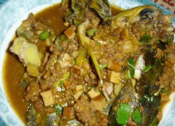醬香黃鼠魚:鍋內放入適量的食油開中火,鍋熱後放入薑片爆香,放入肉末煸炒,最放入豆腐幹丁繼續炒香。加入適量的水,最放入黃鼠魚,加入適量的黃酒燜煮。水開後轉入慢火燜煮,約燜煮20分鐘,稍稍收幹部份湯汁,加入適量的味精、大蒜末即可。