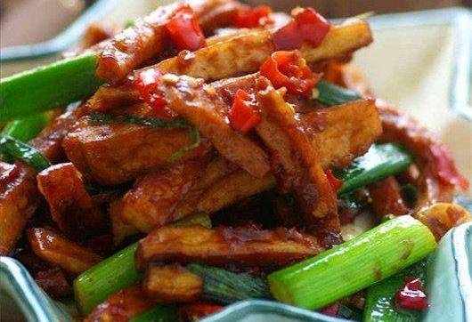 蒜苗辣炒醬香幹:豆幹6塊、蒜苗1棵、蒜2瓣、小紅辣椒2個、黃豆醬1大勺、生抽1湯匙、糖少許、辣椒醬適量,豆幹切條、蒜苗切段、蒜切片、小紅辣椒切碎,鍋中加適量油,大火加熱至五成熱,倒入香幹,調成小火,煎至金黃色,盛出待用,鍋中加入油,加熱至五成熱,轉小火,加入黃豆醬,再放入蒜片和小紅辣椒碎,煸炒至油色發紅,加入煎過的香幹,轉大火,加入生抽和少許白糖,翻炒均勻,最後倒入蒜苗,迅速翻炒幾下即可!