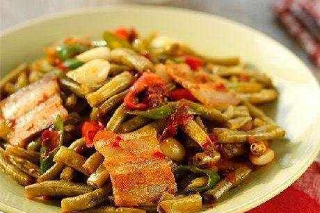 酸豆角炒回鍋肉:酸豆角150克、帶皮五花肉300克、尖紅椒30克、蒜苗50克、色拉油20克、鹽3克、豆瓣醬2克、味精2克、幹椒粉2克、香油2克,將帶皮五花肉入鍋加水,中火煮20分鐘至八成熟撈出晾涼,切成0.2厘米厚的回鍋肉片,炒鍋放底油燒六成熱,下豆瓣醬、回鍋肉大火炒香,再加入酸豆角大火合炒1分鐘,放鹽、味精、幹椒粉調味,下入蒜苗炒5秒,淋香油出鍋即可!
