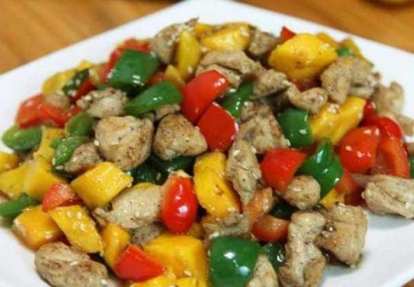 香芒彩椒炒雞丁:1把雞胸肉切成雞丁,放少許鹽,黑胡椒粉拌勻,再加入料酒拌勻,撒上生粉,拌勻。最後放入食用油拌勻,加入薑粒。2把彩椒和芒果切粒,大小與雞丁相仿。3炒鍋燒熱油後,加入雞丁,翻炒至熟盛出待用。4利用鍋裡的餘油炒彩椒丁,加入鹽調味。5把雞丁倒入彩椒中,翻炒幾下。6最後放入芒果粒,撒上芝麻,翻炒兩下,即可