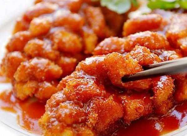 酸甜葡萄魚:1鯉魚留凈魚肉備用2將魚肉從上向下先剞坡刀,再剞直刀,間隔大約在1cm,花刀深至魚皮,放料酒和鹽、少許花椒粉醃漬10分鐘3將醃好的魚肉蘸打撒的蛋液,裹上黃金面包糠,4鍋中倒油,放入魚肉,炸至金黃色,魚肉張開呈葡萄粒狀撈出5留少許底油,爆香蔥薑、放入番茄醬、白醋、白糖、葡萄汁、鹽、加少許水燒至冒泡,倒入水淀粉,燒開後淋入少許明油,8將燒好的湯汁均勻澆到魚肉上即可