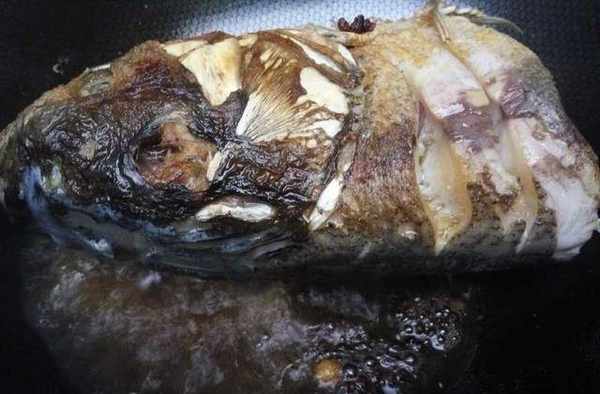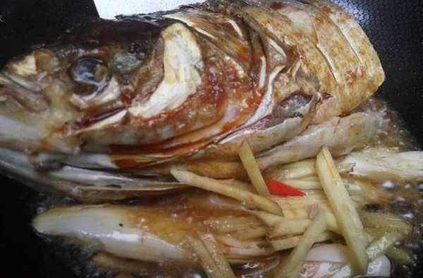 5、加入紅辣椒、料酒,在魚身上澆淋上醬油,接著翻一下身;