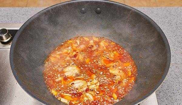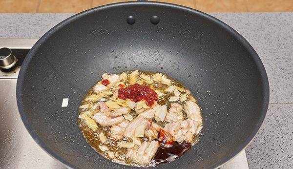 7.放入蠔油8g、辣椒醬8g、料酒10g、醬油5g炒香。