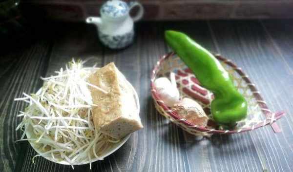 所需食材:豆芽100g、面筋50g、青椒1根、薑5g、蒜3瓣、香油5g、食用油適量、食鹽2g、雞精2g、生抽5g。