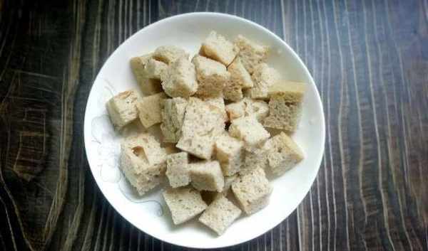 第一步:將面筋用刀切成小塊,然後放入開水中炒2分鐘,除去面筋上的豆腥味,然後擠出面筋中的水分,裝盤備用。