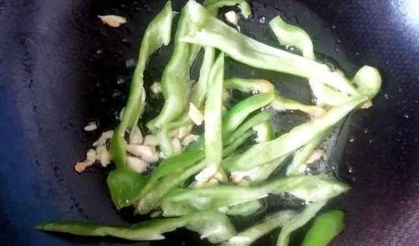 第三步:鍋中倒入食用油,油熱後倒入薑和蒜,爆出薑蒜香。然後倒入切成絲的青椒,翻炒幾下。