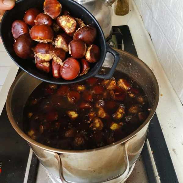 把切好口的栗子全部放入鍋裏,蓋上蓋子大火煮開1分鐘,即刻關火,不要煮的時間太久,時間太久栗子外層就熟了。