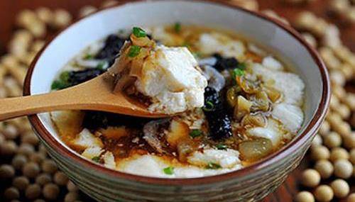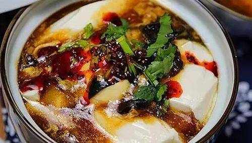 內脂豆腐水分含量高,蒸好後會有很多水浸出,用一個小漏勺把豆腐腦盛入碗中,然後澆上做好的鹵汁,喜歡吃辣的可以淋入少許辣椒油,喜歡吃香菜的放少許香菜末即可。