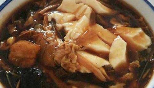 【傢常豆腐腦】食材準備:內脂豆腐2盒、五花肉適量、鮮香菇5朵、木耳5朵、黃花菜20朵、雞蛋1個、薑適量、蔥適量、料酒適量、醬油適量、鹽適量、淀粉適量、八角2個、開水適量。