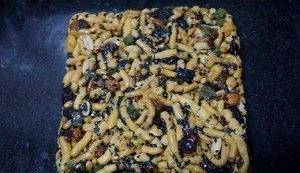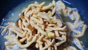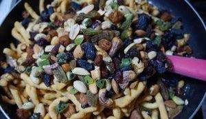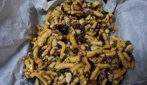 把堅果放大碗裡混合均勻.再把炸好的面條放入混合均勻.