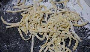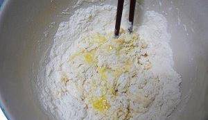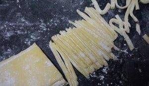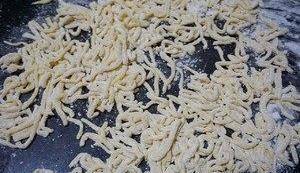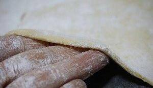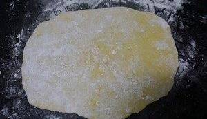 案板上撒一些淀粉防粘.然後把面團搟成面片.形狀無所謂瞭.我這個人隨意起來.我自己都害怕!