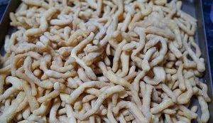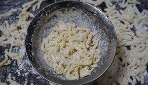 模具如果不是不粘的.就墊一個油紙或刷一層薄油.我這個是8寸的烤盤.有點繡瞭.所以..我墊瞭一個油紙!說好的做金盤一盤的呢?我難道會說.我全部炸好之後.發現娃偷偷的把面條.拿給我媽.我弟一起吃.給吃沒瞭一半?這是做壞事還要拉著同夥的感覺..凸^-^凸
