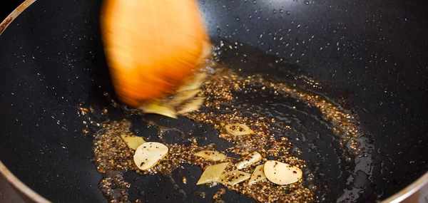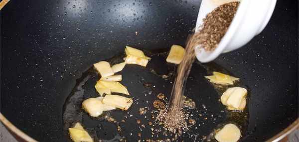 鍋中加入少許油加入蔥片10克和薑片20克炒香再加入靈魂黑胡椒碎10克,我們小火炒香。