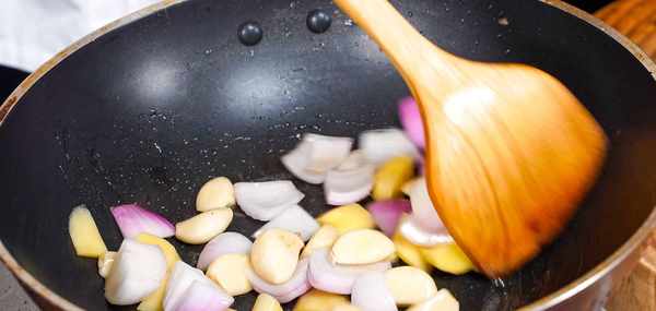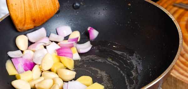 我們加入洋蔥100克 蒜粒100克 生薑100克炒香,差不多顏色微微金黃即可