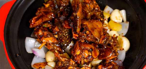 把炒香的甲魚放入砂鍋中,底下的蔥薑蒜用香味把甲魚煨熟!小火5-10分鐘!