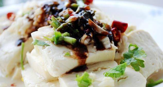 澆汁豆腐:豆腐切塊,加鹽,煮一下,過涼水,擺在盤子裡,切碎蒜末,撒在豆腐上,再加點香菜、幹紅辣椒。炒勺子裡面放上蔥末、黑胡椒粉、蠔油、生抽,再往勺子裡面放一點玉米油,直接在爐灶上面燒開開的,迅速倒在菜上面,一道美味就產生瞭。