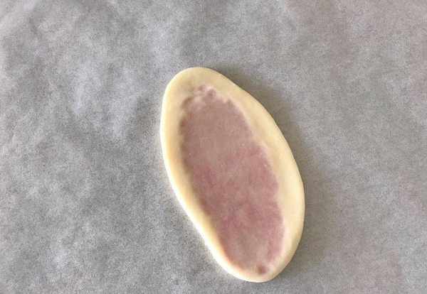 步驟七:靜置好的長條面團滾成圓,壓扁,包上豆沙餡。