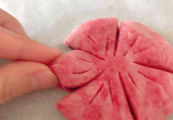 步驟八:壓扁,切五刀,中間再劃幾刀,然後旁邊用手捏起來,做成小花瓣的樣子,挺簡單的,就像是豆沙會粘手,註意餐巾紙擦一擦。