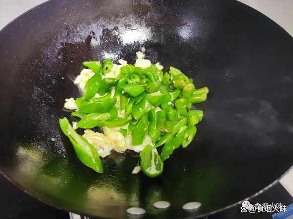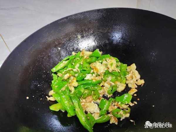 4.將鍋裡面的青椒炒著微微焦香,而且可以聞到一股濃鬱香辣的青椒味後,我們把煎好的雞蛋放入裡面。雞蛋下鍋用鏟子將鍋裡面的所有食材給它們炒均勻,炒均勻瞭之後就可以加入適量的食鹽跟蠔油調味一下。調味好後關火出鍋即可放在盆中。