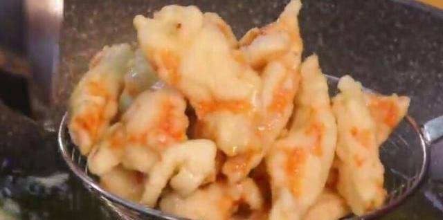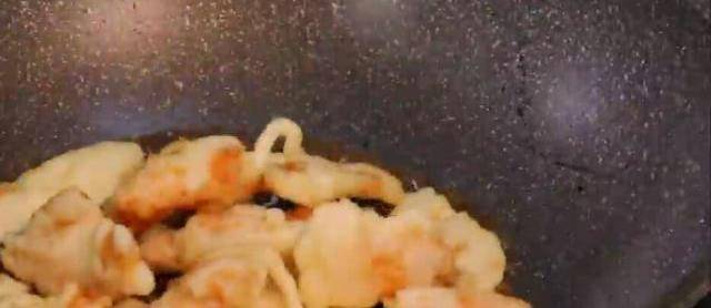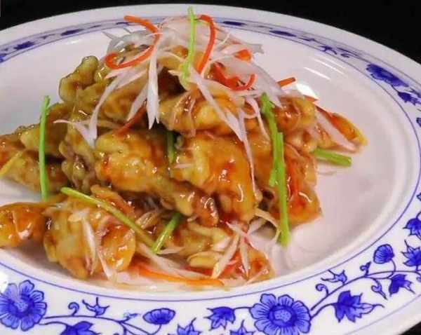 5、火上熱油,油溫5成熱時,逐片將肉片下入鍋中炸制,定型後撈出;繼續升油溫至6成熱時,再次將定型後的肉片入鍋炸制至金黃色時撈出,控油備用;