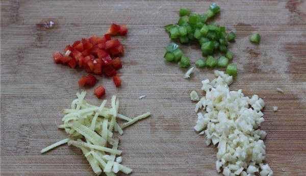 4、蒜剝皮切成末,薑切成細絲,青、紅椒切成粒