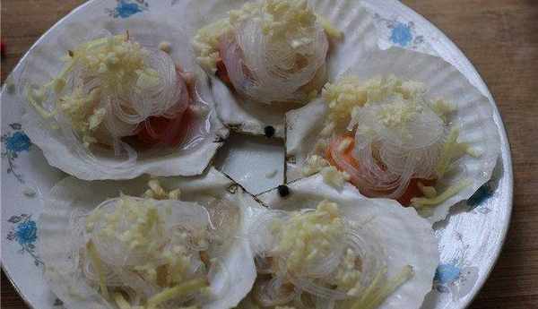 5、將事先處理好的扇貝擺在盤中,依次放入泡軟的粉絲