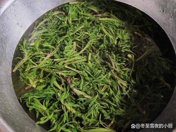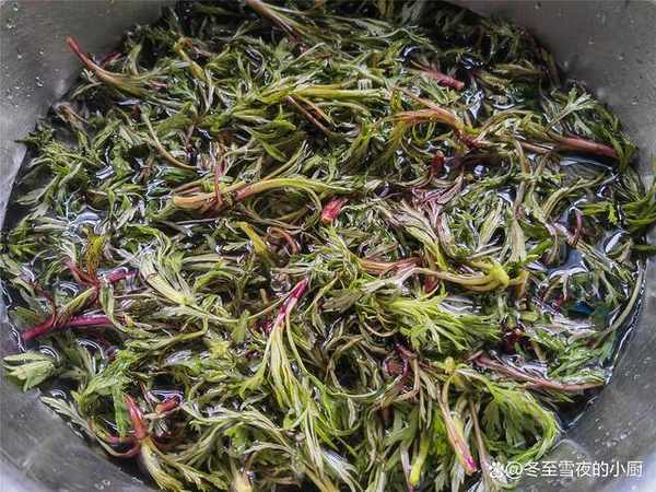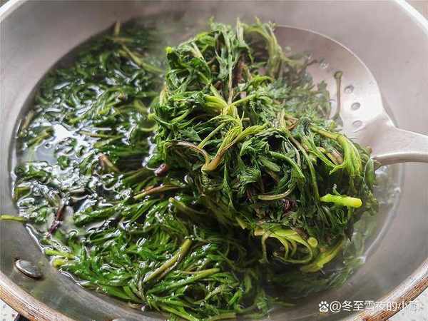 小貼士:柳蒿芽焯水可以去除柳蒿芽的苦味,焯水時間不要過長,焯燙一下即可。焯水時,在水中加入少許鹽,可以使柳蒿芽顏色更綠,柳蒿芽焯水後,馬上放到冷水中投涼,使柳蒿芽迅速降溫,這樣可以保持柳蒿芽清香的口感,而且顏色也不會變黃。