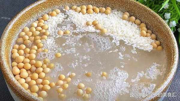 1.250克大米跟80克黃豆放入盆中,加入清水浸泡2個小時以上。