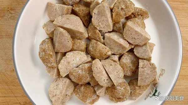 2、準備一些現成的牛肉丸子,超市就有賣的。有時間的朋友自己也可以做一些牛肉丸,牛肉丸多放一些牛肉餡、蔥薑末、少許的面粉、鹽、食用油、十三香調味,把它團成圓形後上鍋蒸熟,取出來晾涼後切換小塊即可。