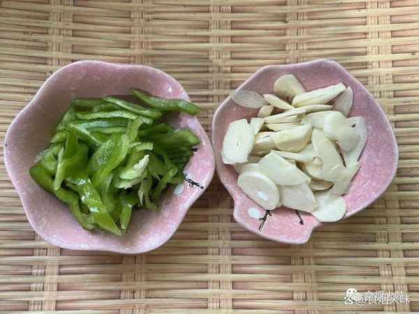 2.生薑,蒜瓣洗凈,洗凈後切片。備好的青椒也是要用手給它搓洗一下,青椒表面搓洗幹凈,用手把青椒蒂給它抽出來,然後沖洗裡面的青椒籽,切成小塊,切好後的青椒段放在一旁備用;