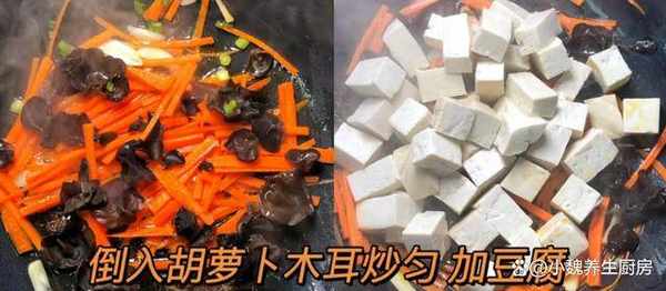 1:提前選購好嫩豆腐,胡蘿卜和黑木耳,先把嫩豆腐用冷水泡一泡,豆腐切成若幹小方塊,鍋中煮一小鍋清水,加上少許食鹽,倒入一些豆腐塊,將豆腐煮2分鐘,去掉豆腐的豆腥味,控幹掉表面的水分。