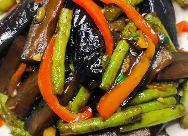 3、鍋中放油,油熱後倒入豆角煎至虎皮狀,茄子煎至兩面金黃,裝盤備用
