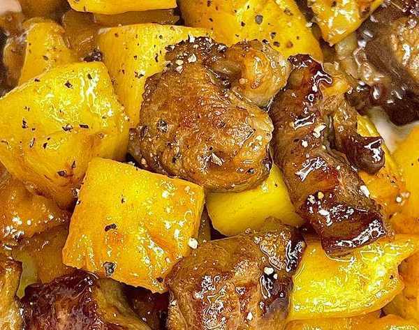 4、鍋中放油,下醃制的牛肉粒,中大火翻炒;牛肉表面焦化,盛出備用,不洗鍋放入菠蘿粒;中大火炒制顏色變深,倒入牛肉粒和酸甜汁