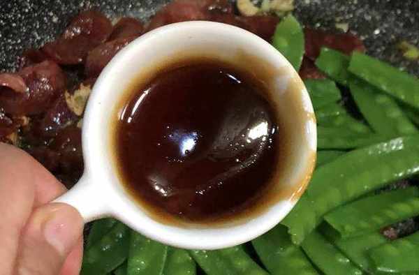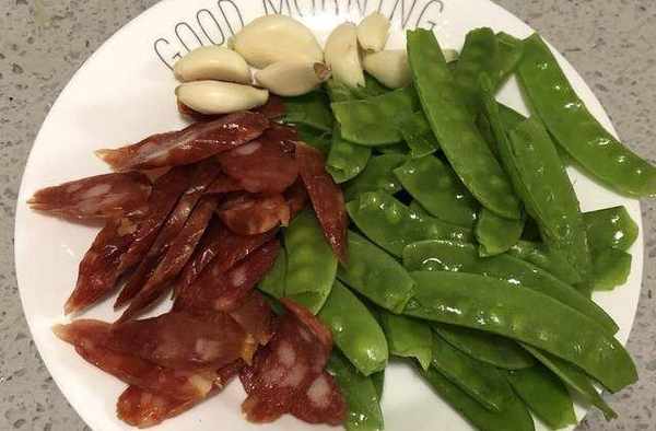 【食材】:荷蘭豆100克、臘肉腸2根、大蒜7粒、清水適量、食用油少許、鹽少許、雞精少許、蠔油1茶匙。