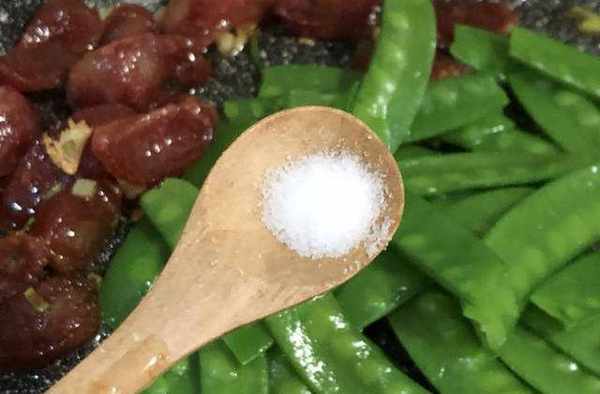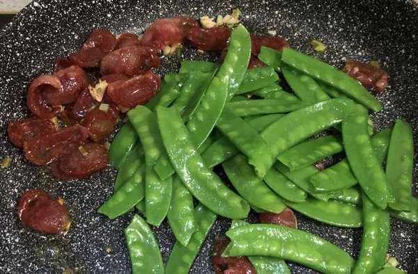 5、之後,放入荷蘭豆和切好的臘腸,再用鏟子給它們翻炒均勻。
